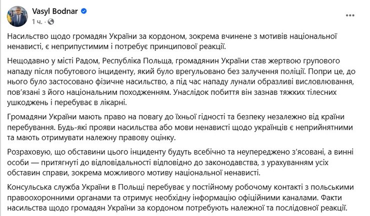 «Граждане Украины имеют право на уважение их достоинства и безопасности независимо от страны пребывания. Любые проявления насилия или языка ненависти в отношении украинцев неприемлемы и должны получать надлежащую правовую оценку. Рассчитываю, что обстоятельства этого инцидента будут всесторонне и беспристрастно выяснены, а виновные лица привлечены к ответственности в соответствии с законодательством, с учетом всех обстоятельств дела, в частности возможного мотива национальной ненависти», – подчеркнул он.